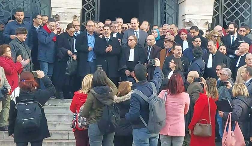 Plusieurs avocats, magistrats et personnalités publiques se sont rassemblés sur les marches du Tribunal de première instance de Tunis en guise de soutien au porte-parole du comité de défense des magistrats révoqués par décret présidentiel, Ayachi Hammami. Ce dernier fait l’objet d’une enquête suite à une procédure engagée par la ministre de la Justice, Leila Jaffel, en vertu du décret n°54 relatif à la lutte contre les infractions se rapportant aux systèmes d\’information et de communication. M. Hammami, avait indiqué qu’il était accusé d\’avoir « usé des réseaux sociaux pour répandre des rumeurs dans le but de porter atteinte à la sécurité publique ».