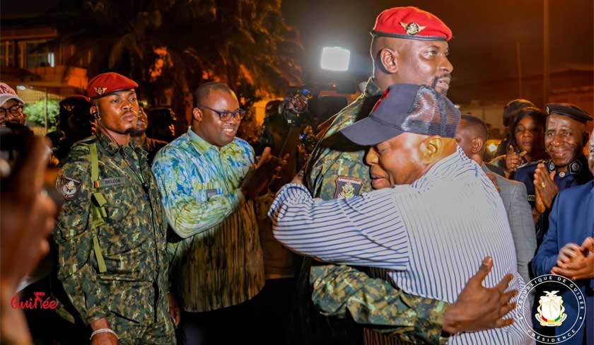 Le président de la République de Guinée, Mamadi Doumbouya, s’est rendu, en personne à l’aéroport pour accueillir ses compatriotes évacués depuis la Tunisie. Les images publiées montrent des citoyens exténués, heureux de rentrer chez eux et enlaçant un à un leur président. Des images qui se rapprochent d’une évacuation suite à une catastrophe naturelle majeure. Le communiqué a indiqué que : « Les Guinéens, bien que fatigués étaient toujours tous fiers de leur arrivée et la présence à l’aéroport de leurs dirigeants… leur a fait oublier le traumatisme lié aux convulsions de ces derniers jours en Tunisie… Scène triste et poignante de cet accueil, c’est quand le chef de l’Etat a montré son émotion et sa compassion en prenant dans ses bras un bébé âgé de quelques mois d’une compatriote obligée de fuir la Tunisie ».