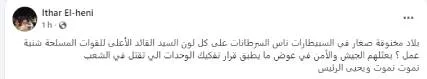 La jeune activiste Ithar El Heni a, de son côté, exprimé sa colère dans un post virulent : « Un pays asphyxié : des enfants à l’hôpital, des malades du cancer de toutes sortes… Et que fait le chef suprême des forces armées ? Il leur envoie l’armée et la police au lieu d’appliquer la décision de démanteler les unités qui tuent le peuple ».