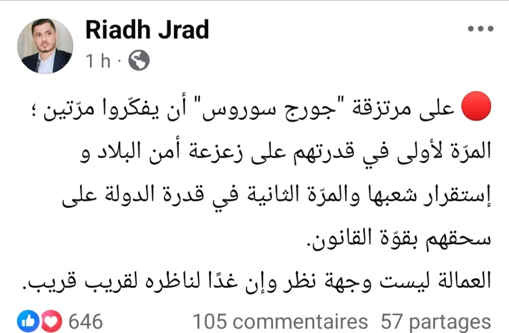 Une nouvelle sortie de Riadh Jrad, figure connue pour ses positions pro-régime, a enflammé les réseaux sociaux. Dans une publication au ton martial, publiée ce dimanche 12 octobre 2025, il écrit : « Aux mercenaires de George Soros, qu’ils réfléchissent deux fois : une première fois à leur capacité de déstabiliser la sécurité du pays et la stabilité de son peuple, et une seconde à la capacité de l’État à les écraser par la force de la loi. La trahison n’est pas une opinion et demain est tout proche. »