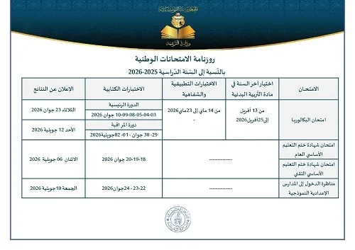 Le ministère de l’Éducation a publié, mardi 14 octobre 2025, le calendrier officiel des examens nationaux pour l’année scolaire 2025-2026.