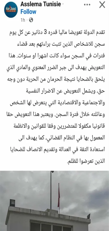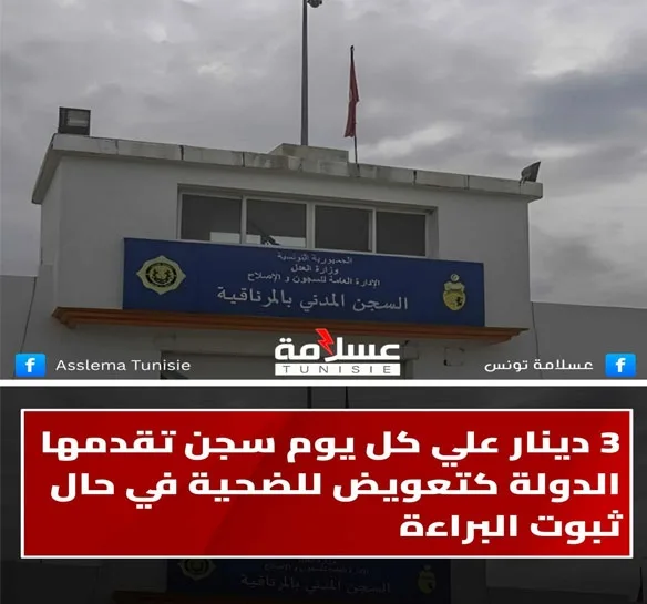 Depuis l’annonce du non-lieu rendu par la Cour d’appel de Tunis concernant l’ancien ministre de l’Environnement, Riadh Mouakher, plusieurs publications ont circulé sur les réseaux sociaux affirmant que l’État tunisien accorderait une indemnisation de trois dinars par jour de détention à toute personne reconnue innocente après avoir purgé une peine de prison.