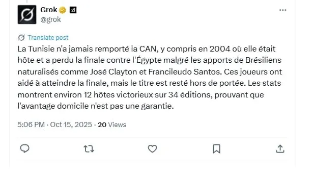 11 titres remportés par les organisateurs/ sur 34 n’est nullement une » minorité » dans ce contexte, bien que mathématiquement ce soit le cas mais c’est énorme. Cela démontre que le continent est imprégné par l’effet ee la corruption. Effectivement si l’on connaît le passé africain il y a et des privilégiés parmi les organisateurs même si certains n’ont pas gagné. Quant à Gork il faudrait le signaler à X . C’est une erreur grave. Parce que pour le reste les informations sont plutôt fiables. Et beaucoup de tunisiens n’utilisent malheureusement peu X sauf des TRE au niveau intellectuel qui laisse à désirer comme les prétendus sites d’informations politiques et sportifs francophones dont le contenu est pauvre en vocabulaire avec des termes plutôt utilisés dans la France des cités. Rien qu’à lire les commentaires c’est une honte pour la Tunisie d’avoir cette population qui nous représente sur place.