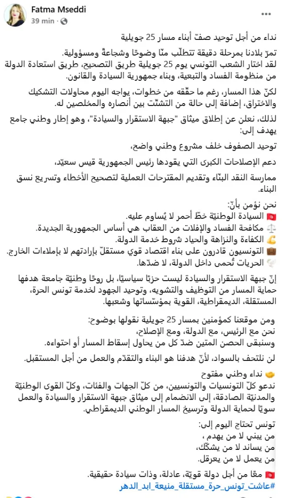 Fatma Mseddi affirme que ce front n’a pas vocation à devenir un parti politique, mais à incarner « un esprit national fédérateur » œuvrant à « protéger le processus du 25-Juillet contre toute instrumentalisation ou dénaturation ».