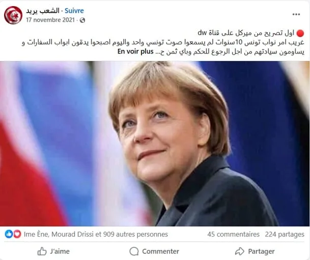 Une citation attribuée à l’ancienne chancelière allemande Angela Merkel circule largement sur les réseaux sociaux en Tunisie depuis plusieurs semaines. On y lit une sévère critique des anciens députés tunisiens, accusés de ne pas avoir écouté le peuple pendant dix ans et de désormais « frapper aux portes des ambassades » pour revenir au pouvoir, quitte à « vendre leur pays ».