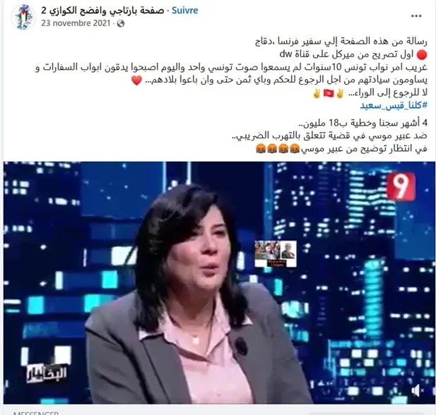 Nos recherches montrent qu’elle est apparue pour la première fois en août 2021, peu après la décision du président tunisien Kaïs Saïed de geler les travaux du Parlement le 25 juillet 2021. À cette période de forte tension politique, de nombreuses fausses citations et montages circulaient en ligne, souvent attribués à des figures internationales afin de légitimer une opinion ou une position politique.