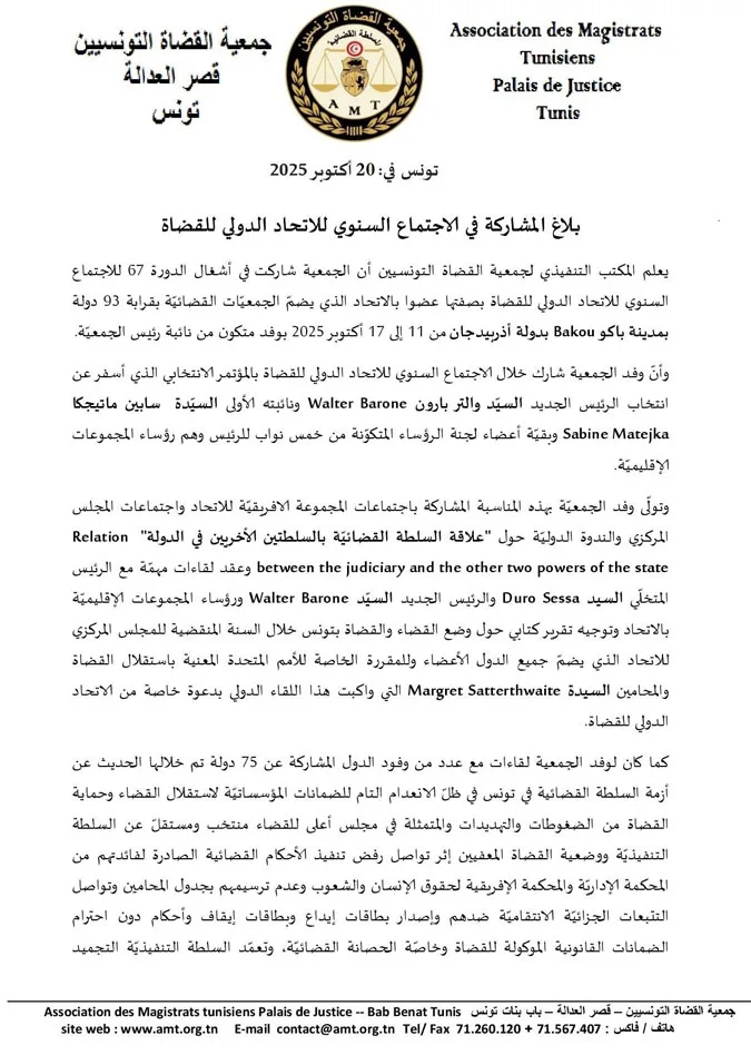 L’Association des magistrats tunisiens a dénoncé, à l’occasion de sa participation à la 67ᵉ session annuelle de l’Union internationale des magistrats tenue à Bakou du 11 au 17 octobre 2025, la dégradation continue de l’indépendance du pouvoir judiciaire en Tunisie.