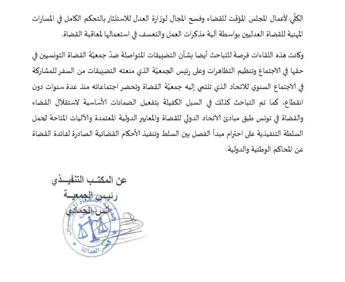 Les représentants de l’Association des magistrats tunisiens ont appelé, lors de leurs échanges avec les délégations de 75 pays, à réactiver les garanties fondamentales de l’indépendance du pouvoir judiciaire en Tunisie, conformément aux principes de l’Union internationale des magistrats et aux normes internationales relatives à la séparation des pouvoirs.