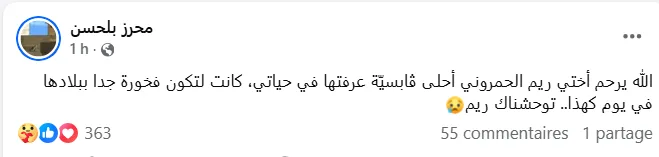 « Que Dieu ait pitié de ma sœur Rym Hamrouni, la plus belle Gabésienne que j’aie connue. Elle aurait été si fière de son peuple en ce jour. Tu nous manques, Rym. »