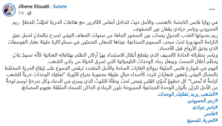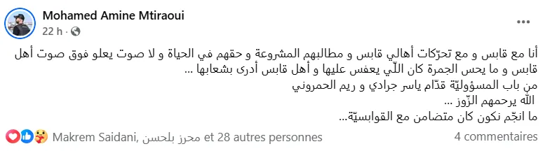 « Je suis avec Gabès, avec ses habitants et leurs revendications légitimes. Personne ne peut comprendre la brûlure mieux que celui qui marche dessus… Par devoir envers Yasser Jradi et Rym Hamrouni, que Dieu ait leurs âmes, je ne peux qu’être solidaire des Gabésiens. »