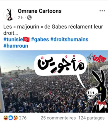 Le caricaturiste Omrane Cartoons a publié une illustration accompagnée d’un commentaire laconique : « Les ‘ma’jourin’ (vendus) de Gabès réclament leur droit… »