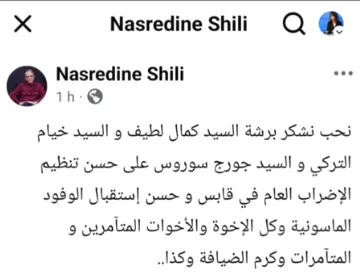 L’acteur et réalisateur Nasreddine Shili a publié un post au ton ouvertement moqueur : « J’aimerais remercier chaleureusement M. Kamel Letaïef, M. Khayam Turki et M. George Soros pour la parfaite organisation de la grève générale à Gabès, l’accueil des délégations maçonniques et la générosité de nos frères et sœurs conspirateurs et conspiratrices… »