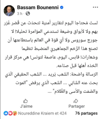 « Pas besoin aujourd’hui de rapports sécuritaires parlant de naïfs manipulés, ni d’abjects mégaphones invoquant la théorie du complot. Ni George Soros ni aucune puissance au monde ne peut fabriquer un tel élan populaire, discipliné, organisé, et porteur de slogans clairs. Gabès aujourd’hui est la capitale de la Tunisie, le centre d’une décision prise par son peuple avant même ses dirigeants. Le message est limpide : le peuple veut… le vrai peuple, celui qui refuse la mort, le silence, la tristesse et l’obscurité. »