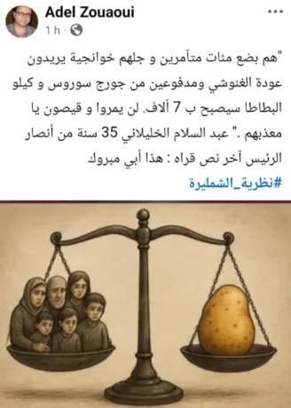 « Ce ne sont que quelques centaines de conspirateurs, la plupart des islamistes nostalgiques de Ghannouchi, payés par George Soros, et d’ailleurs le kilo de pommes de terre coûtera bientôt sept dinars. Ils ne passeront pas, et Kaïs les tourmente ! » Une allusion aux propos tenus par le propagandiste Riadh Jrad qui avait soutenu hier que si le Groupe chimique fermait ses portes, le kilo de pommes de terre grimperait à sept dinars.