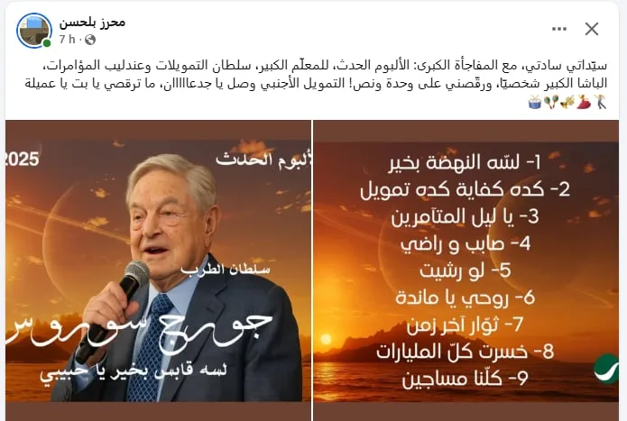 Le blogueur Mehrez Belhassen a partagé quant à lui une image détournée du lobbyiste George Soros, présenté comme une vedette chantant des paroles humoristiques. L’auteur accompagne cette parodie d’un commentaire moqueur sur les théories du complot liées au financement étranger : « Tenez-vous prêts, mes amis, pour la grande surprise ! Le grand événement d’aujourd’hui : le grand maître des financements, le sultan des fonds et le tortionnaire des conspirations. Le grand parrain est arrivé ! Le financement étranger est arrivé, mesdames et messieurs ! ».