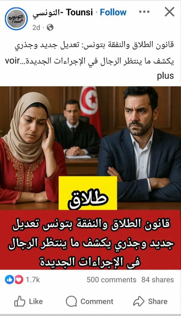 Le message diffusé sur Facebook affirme qu’un nouveau texte de loi aurait été adopté, durcissant les règles relatives à la pension alimentaire et au divorce. Selon cette publication, ces prétendus changements auraient pour effet de renforcer les sanctions à l’encontre des hommes ou d’alourdir leurs obligations financières après une séparation. Cette rumeur a suscité de nombreux commentaires et inquiétudes, plusieurs internautes croyant que le gouvernement tunisien aurait discrètement adopté une nouvelle législation.