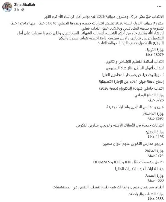 La députée et membre de la commission des finances et du budget à l’Assemblée des représentants du peuple (ARP), Zina Jiballah, a publié jeudi 23 octobre 2025 un post Facebook détaillant ces nouvelles embauches prévues dans le projet de budget de l’État.