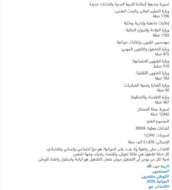 Le projet de budget de l’État pour 2026 prévoit près de 52.000 affectations, réparties entre régularisations de contrats et nouvelles embauches effectives, couvrant l’ensemble des ministères et secteurs clés de l’État.