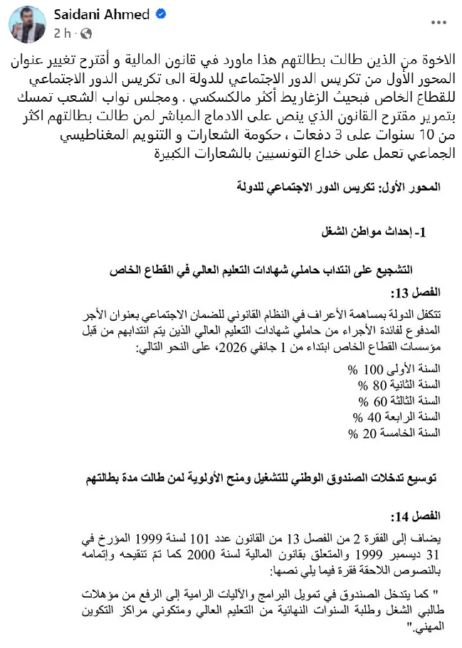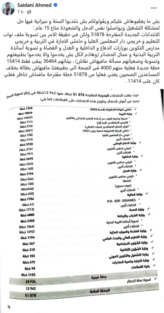 Dans un autre message, Ahmed Saidani s’adresse directement aux chômeurs de longue durée, estimant que le projet de loi de finances 2026 tourne le dos à leurs revendications.