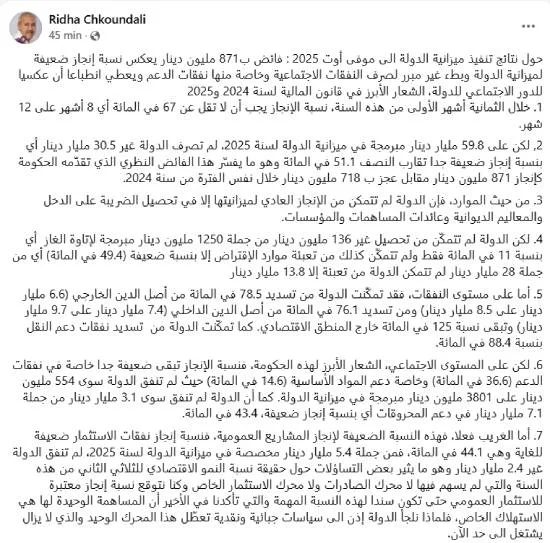 Dans un post publié sur sa page Facebook le vendredi 24 octobre 2025, le professeur universitaire en économie a estimé que « cet excédent reflète un faible taux d’exécution du budget et une lenteur injustifiée dans la dépense sociale, surtout celle liée au soutien ». Une situation qui, selon lui, « donne l’impression d’un renversement du rôle social de l’État, pourtant présenté comme le principal slogan des Lois de finances 2024 et 2025 ».