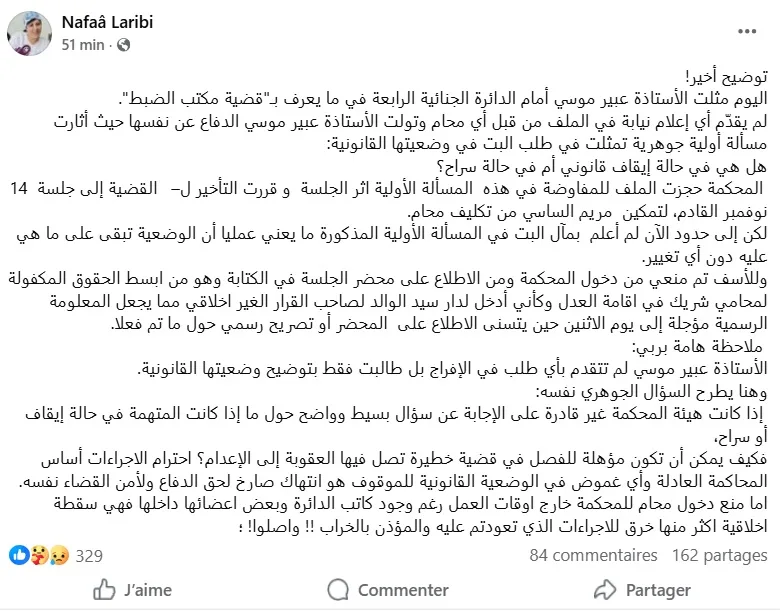 Me Laribi souligne par ailleurs qu’aucune demande de libération n’a été déposée par Abir Moussi. Cette dernière a simplement exigé que sa situation légale soit clarifiée.