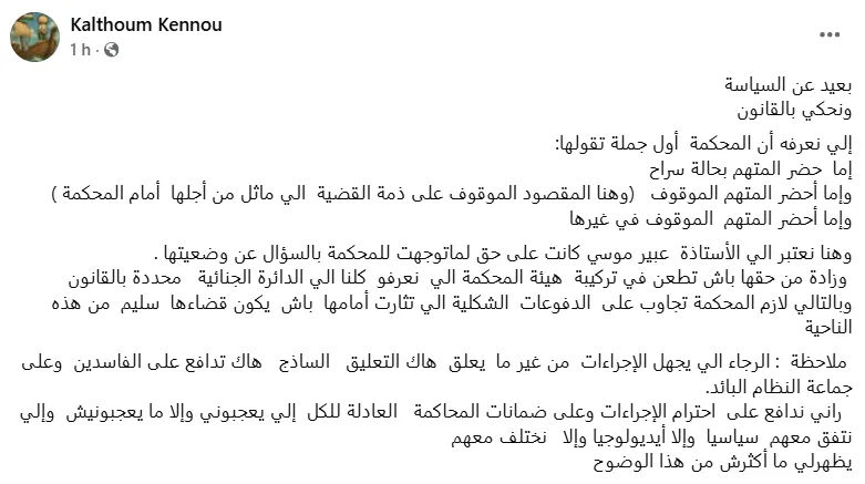 Enfin, Kalthoum Kennou a tenu à préciser que sa position ne relevait pas d’un soutien politique : « je défends le respect des procédures et les garanties d’un procès équitable pour tous — qu’ils me plaisent ou non, que je sois d’accord ou non avec eux sur le plan politique ou idéologique. »