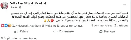 Dans une déclaration postée sur les réseaux sociaux, l’avocate Dalila Ben Mbarek Msaddek a indiqué que le bâtonnier, Boubaker Bethabet, a informé le tribunal de la décision de ne déposer aucune déclaration de représentation dans l’affaire du complot tant que les irrégularités procédurales ne seront pas corrigées.
