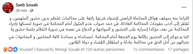 Dans une déclaration publiée sur les réseaux sociaux, ce mardi 28 octobre 2025, son fils Saeb Souab a affirmé qu’Ahmed Souab demeure attaché à son droit de comparaître physiquement devant la cour afin de se défendre et affronter les accusations portées contre lui.