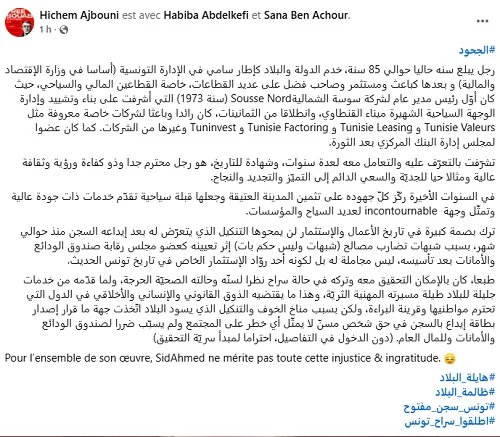 L’ancien député et dirigeant du parti Attayar, Hichem Ajbouni, a exprimé une profonde indignation face au sort réservé à Ahmed Abdelkefi, homme d’affaires de 85 ans et père de l’ancien ministre des Finances Mohamed Fadhel Abdelkefi.