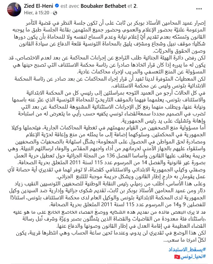 Zied El-Heni a mis en lumière la situation critique des audiences dans l’affaire. Il y loue le rôle du bâtonnier de l’Ordre des avocats, Boubaker Ben Thabet, pour son insistance à ce que les séances soient publiques, avec la présence des journalistes et du public, et pour son refus de se limiter à un rôle purement symbolique dans la défense.