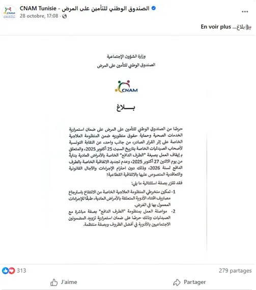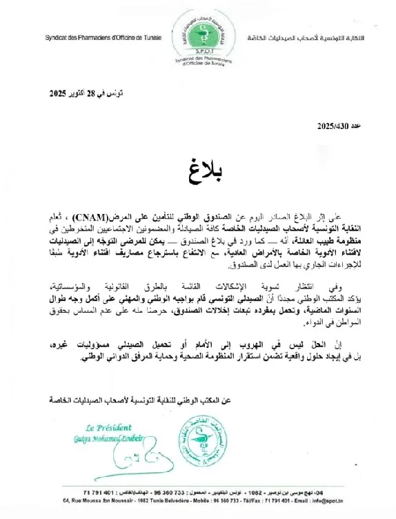 Dans un communiqué publié samedi 25 octobre, à l’issue de son assemblée générale extraordinaire, le Syndicat des pharmaciens d’officine de Tunisie (SPOT) a annoncé l’arrêt du système du tiers payant pour les maladies ordinaires à compter du lundi 27 octobre 2025, dénonçant le non-respect par la CNAM des engagements prévus dans la convention en vigueur. Ils ont également annoncé leur refus de renouveler cette convention dans sa forme actuelle pour 2026. Puis la Caisse nationale d’assurance maladie (Cnam) a annoncé, dans un communiqué publié ce mardi 28 octobre 2025, qu’elle veillera à « garantir la continuité des services de santé et à préserver les droits de ses affiliés au sein du système de soins privés », à la suite de la décision « unilatérale » prise par le syndicat.