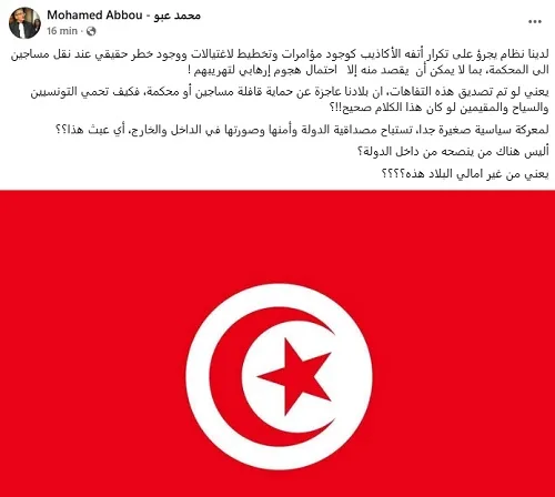 « Nous avons un régime qui ose répéter les mensonges les plus absurdes, comme l’existence de complots, de plans d’assassinats et d’un danger réel lors du transfert de prisonniers vers le tribunal — ce qui ne peut signifier qu’une seule chose : la possibilité d’une attaque terroriste pour les libérer ! », a-t-il écrit. Et d’ajouter : « Si l’on croit à ces balivernes, cela voudrait dire que notre pays est incapable d’assurer la sécurité d’un convoi de détenus ou d’un tribunal. Alors comment pourrait-il protéger les Tunisiens, les touristes et les résidents ? »
