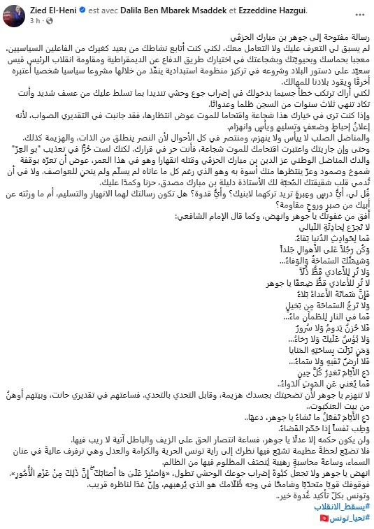 Le journaliste Zied El Heni a adressé, ce vendredi 7 novembre 2025, une lettre ouverte à l’opposant politique Jaouhar Ben Mbarek, actuellement en grève de la faim sauvage à la prison de Belli. Tout en saluant son engagement pour la défense de la démocratie et son opposition au processus instauré par le président de la République Kaïs Saïed, il l’appelle à mettre fin à la grève, estimant qu’elle constitue « une défaite » et qu’elle inflige une douleur insoutenable à ses proches, notamment à son père, l’ancien militant Ezzeddine Hazgui, et à sa sœur, l’avocate Dalila Ben Mbarek.
