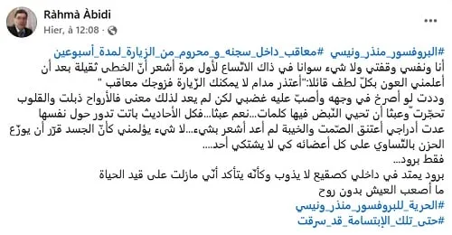 L’épouse de Mondher Ounissi, Rahma Abidi, a publié, vendredi 7 novembre 2025, un témoignage sur les réseaux sociaux. Elle y affirme que son mari, détenu à la prison de la Mornaguia, a été privé de visites pendant deux semaines en guise de sanction. Elle raconte s’être présentée au parloir avant d’être informée par un agent pénitentiaire qu’elle n’était pas autorisée à le voir, évoquant une « punition » décidée à l’encontre du prisonnier.