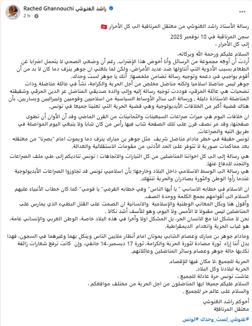 Depuis la prison d’El Mornaguia, où il est détenu depuis avril 2023, le président du mouvement Ennahdha, Rached Ghannouchi, a adressé, lundi 10 novembre 2025, une lettre ouverte exprimant sa solidarité avec le militant Jaouhar Ben Mbarek, actuellement en grève de la faim, et appelle les Tunisiens de toutes tendances à s’unir autour d’une cause commune : la liberté.