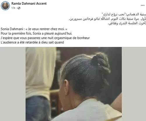 Un autre témoignage venant de sa sœur, Ramla Dahmani Accent a souligné la détresse de l’avocate incarcérée. « Sonia Dahmani : “Je veux rentrer chez moi.” Pour la première fois, Sonia a pleuré aujourd’hui », écrit-elle, avant d’ajouter avec amertume : « J’espère que vous passerez une nuit orgasmique de bonheur. L’audience a été retardée à Dieu sait quand. »