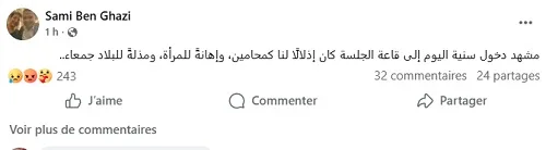 La scène de l’entrée de Sonia Dahmani dans la salle d’audience, mardi 11 novembre 2025, a profondément marqué les présents. L’avocat Sami Ben Ghazi a dénoncé « une humiliation pour les avocats, une offense faite à la femme et une honte pour tout le pays ». Selon lui, les conditions dans lesquelles l’avocate est apparue devant le tribunal portent atteinte à la dignité de tous.