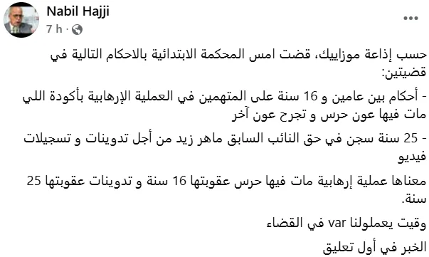 Sur sa page officielle, M. Hajji a mis en parallèle cette peine avec celles prononcées dans une autre affaire terroriste, illustrant à sa manière les incohérences de la justice tunisienne.