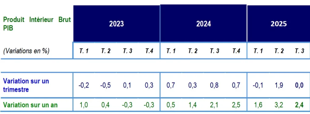 En revanche, l’évolution trimestrielle montre une situation plus stable : par rapport au deuxième trimestre 2025, le PIB en volume affiche une variation nulle (0,0 %), traduisant une stagnation de l’activité économique sur la période.