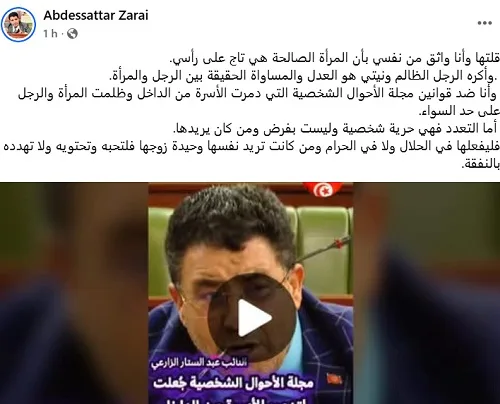 Dans son post, Abdessattar Zarai réaffirme sa vision : « la femme vertueuse est une couronne posée sur ma tête », dit-il, assurant vouloir défendre « la justice et l’égalité réelle entre l’homme et la femme ». Il accuse les lois actuelles du CSP d’avoir « détruit la famille de l’intérieur » et d’avoir « lésé » autant les hommes que les femmes.