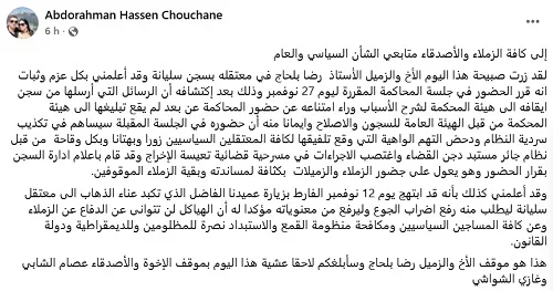 Ridha Belhaj a informé la direction de la prison de sa décision et appelle ses confrères à une présence massive lors de cette audience pour soutenir l’ensemble des prévenus.