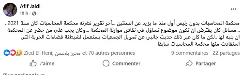 En parallèle, le magistrat Afif Jaidi a publié un message soulignant plusieurs points absents du débat parlementaire. Il rappelle que la Cour des comptes est sans premier président depuis plus de deux ans et que le dernier rapport publié par l’institution date de 2021. Selon lui, ces sujets auraient dû être au cœur des interrogations lors de l’examen du budget de la Cour. Il estime qu’il appartenait aux représentants de la Cour présents à la séance de les signaler. Il déplore qu’« un discours périphérique sur le financement des associations » ait été mis en avant, discours qu’il décrit comme un moyen de « diaboliser des espaces de liberté dont la Cour des comptes avait elle-même bénéficié par le passé ».