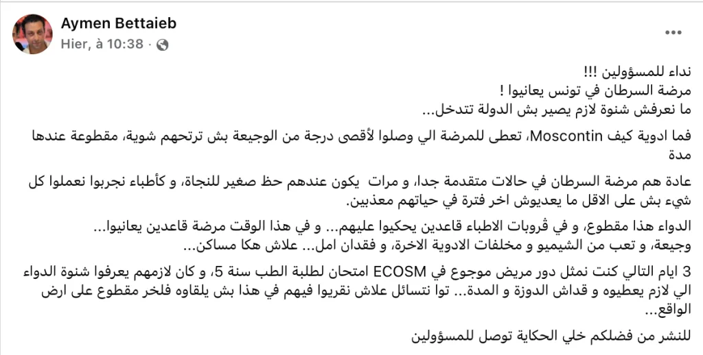 Un autre médecin, Aymen Bettaieb, ancien vice-président de l’Organisation tunisienne des jeunes médecins, a lui aussi tiré la sonnette d’alarme. Dans une publication datée du dimanche 23 novembre 2025, il a dénoncé la rupture prolongée du Moscontin, un antalgique opioïde prescrit aux patients en phase très avancée de la maladie.