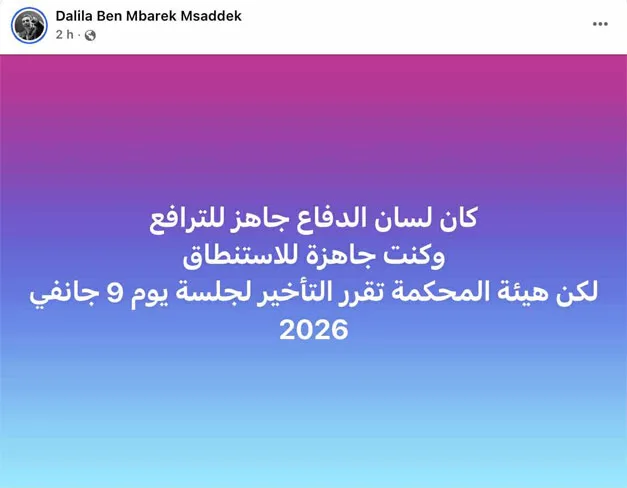 L’audience concernant Dalila Ben Mbarek Msaddek et Borhen Bssais, initialement programmée ce mardi 25 novembre 2025, a été reportée au 9 janvier 2026.