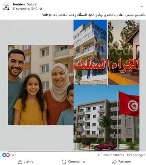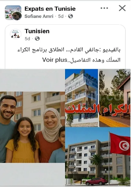 Sur Facebook, plusieurs publications affirment que la Tunisie aurait déjà lancé une nouvelle formule de « location-accession » permettant aux citoyens d’obtenir un logement immédiatement. Certaines publications indiquent même que l’État a commencé la mise en œuvre du programme et que les logements seraient disponibles dès janvier 2026.