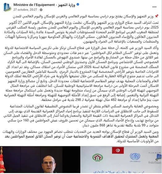 Le ministre de l’Équipement, Salah Zouari, a déclaré le 27 octobre 2025, que l’État consacrera 25 millions de dinars à un programme de location-accession à partir de 2026. Il a confirmé que le ministère prévoit la construction de 1000 logements destinés aux salariés, répartis entre le Grand Tunis et d’autres gouvernorats. Ce programme sera mis en œuvre progressivement, en fonction des terrains disponibles.
