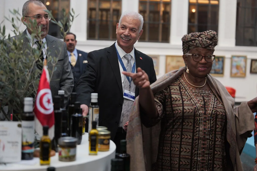 À l’issue de leur rencontre, Samir Abid et Ngozi Okonjo-Iweala ont effectué une tournée dans le hall principal du siège de l’OMC, où se tient une exposition de promotion des produits tunisiens les 26 et 27 novembre 2025.