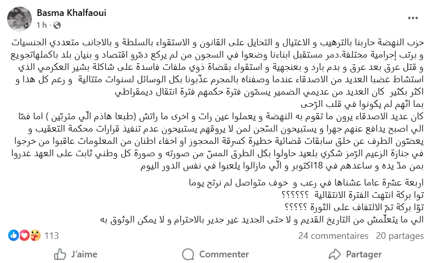 Basma Khalfaoui reproche au parti d’avoir « détruit l’avenir des jeunes, ruiné l’économie et affaibli l’État », évoquant un climat d’« appauvrissement » et de « décomposition » imposé au pays. Elle assure que des citoyens ont été emprisonnés pour leurs positions politiques et que « des réseaux criminels et des responsables bénéficiant de multiples nationalités » auraient, selon elle, été protégés par des figures influentes au sein du parti.