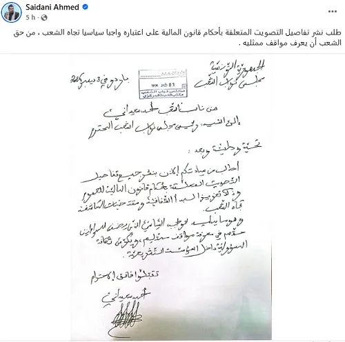 Selon le parlementaire, la publication de ces données permettrait aux Tunisiens de connaître clairement les positions de leurs représentants sur chaque article adopté ou rejeté dans le cadre du projet de loi. Dans ce sens, Ahmed Saïdani a adressé, mercredi 3 décembre 2025, une lettre formelle au président de l’Assemblée des représentants du peuple (ARP) afin de réclamer la mise à disposition de ces informations.