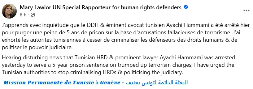 Mary Lawlor, rapporteuse spéciale de l’ONU sur les défenseurs des droits humains, a dénoncé une procédure fondée, selon elle, sur des accusations « fallacieuses » de terrorisme. « J’apprends avec inquiétude que le défenseur des droits humains et éminent avocat tunisien Ayachi Hammami a été arrêté pour purger une peine de cinq ans sur la base d’accusations fallacieuses. J’ai exhorté les autorités tunisiennes à cesser de criminaliser les défenseurs des droits humains et de politiser le pouvoir judiciaire », a-t-elle déclaré.